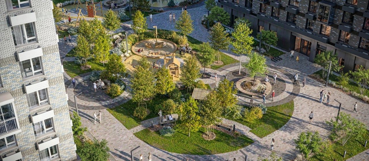 В жилом квартале появится уникальное общественное пространство с пешеходным бульваром и зонами для отдыха. На первых этажах откроются кафе, магазины и полезные сервисы, куда можно спуститься за горячим кофе или свежеиспечённым хлебом. Из каждого дома будет выход в уютный двор-парк с современными детскими и спортивными площадками. Здесь мы посадим цветы и деревья: будет приятно отдыхать или почитать книгу. Артикул 1050630 (Застройщик ООО ''СЗ ФОРМУЛА-ДВ'')