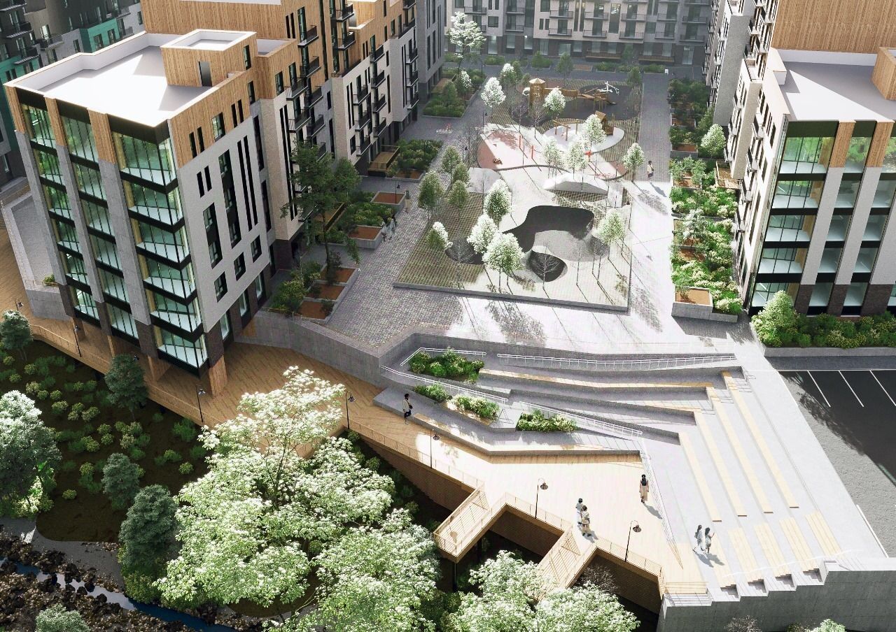 Проект отличается продуманным ландшафтом и общественными пространствами: •собственная набережная вдоль реки •амфитеатр и видовые площадки •свободный Wi-Fi по всей территории •большое количество зон отдыха и детских площадок.
